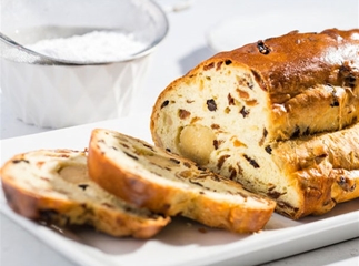 Ambachtelijk gemaakte Kerststol. Bereid met roomboter en rijk gevuld met rozijnen, krenten, abrikoosstukjes, een vleugje rum en natuurlijk de allerlekkerste amandelspijs.